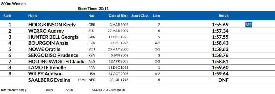 女子800米——霍奇金森以1:55.69折桂,改写了保持23年之久的赛会纪录。