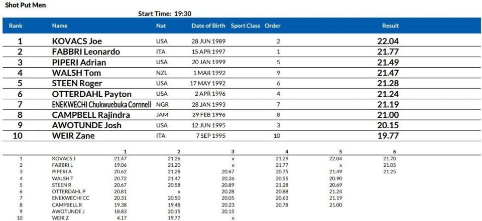 男子铅球——美国选手科瓦茨以22.04米夺冠。
