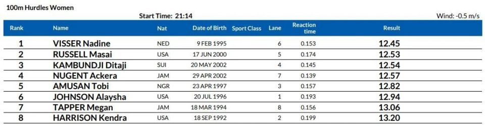 女子100米栏——荷兰姑娘维塞尔以12.45秒夺冠。