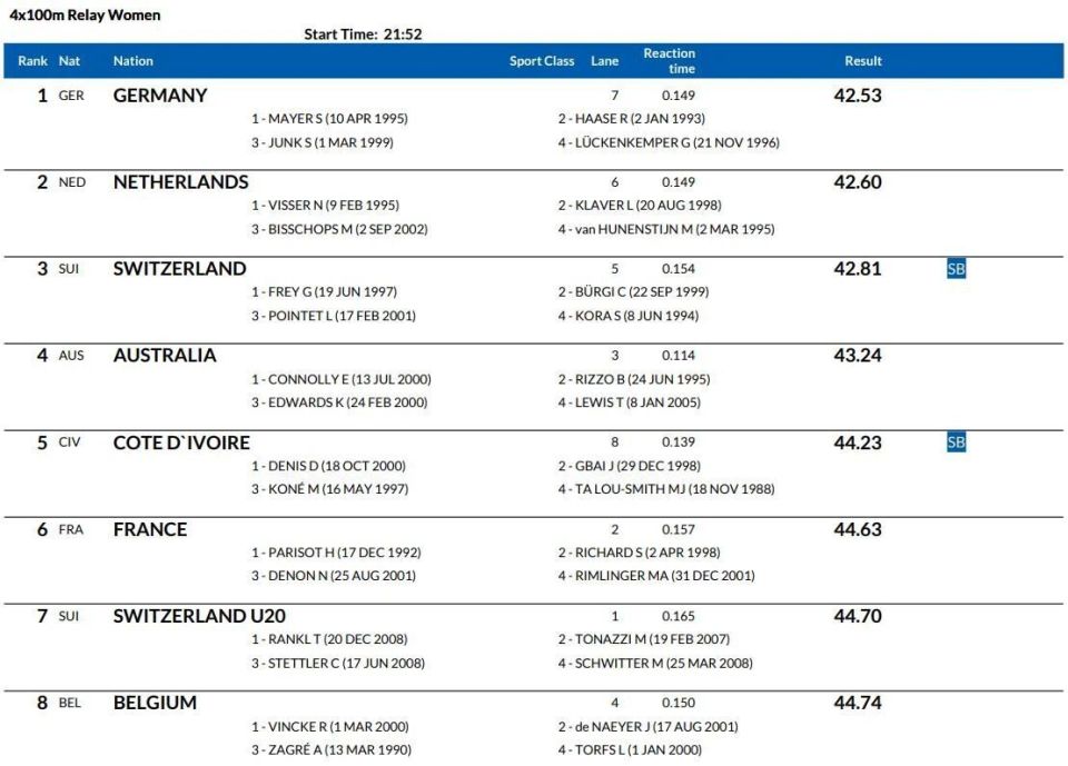 女子4×100米接力——德国队夺冠,荷兰队与瑞士队分获二三。