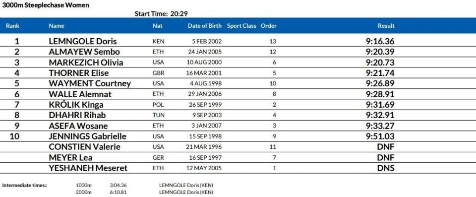 女子3000米障碍——肯尼亚的雷曼格勒以9:16.36夺冠。