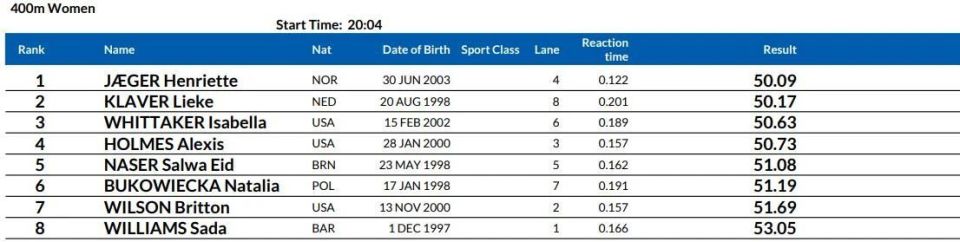 女子400米——挪威选手贾格尔以50.09秒率先撞线。
