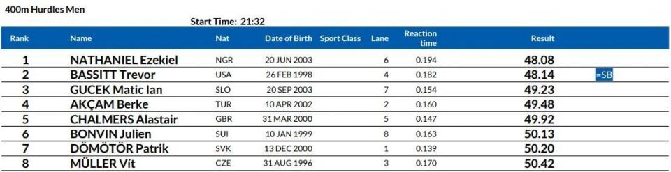 再来重温刘翔保持的赛会纪录12.88秒——男子400米栏——尼日利亚选手纳塔尼尔以48.08秒夺冠。