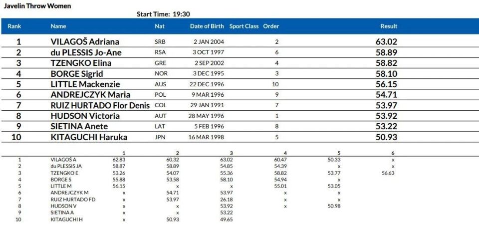 女子标枪——塞尔维亚选手维拉格斯以63.02米夺冠,只有她一人打开了60米。