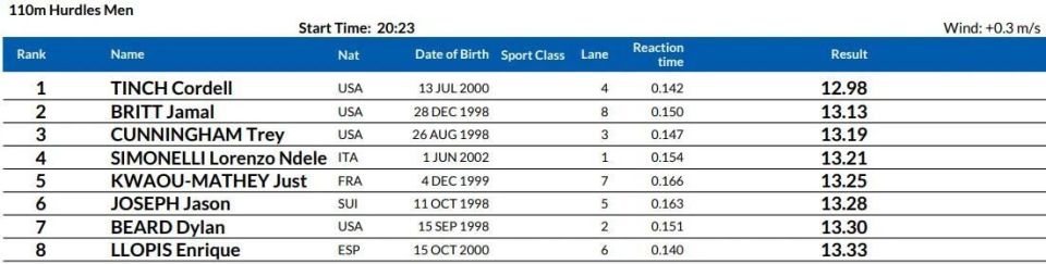 男子110米栏——美国选手廷奇以12.98秒折桂。