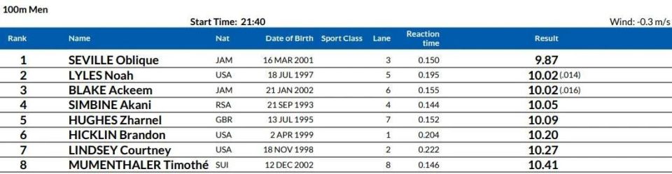 北京时间8月21日凌晨,2025年世界田联钻石联赛洛桑站在雨中精彩举行。来看详细战报——男子100米——牙买加的塞维尔以9.87秒夺冠,莱尔斯摘银。男子800米——美国选手霍伊战胜了肯尼亚的万永伊,以1:42.82夺冠。