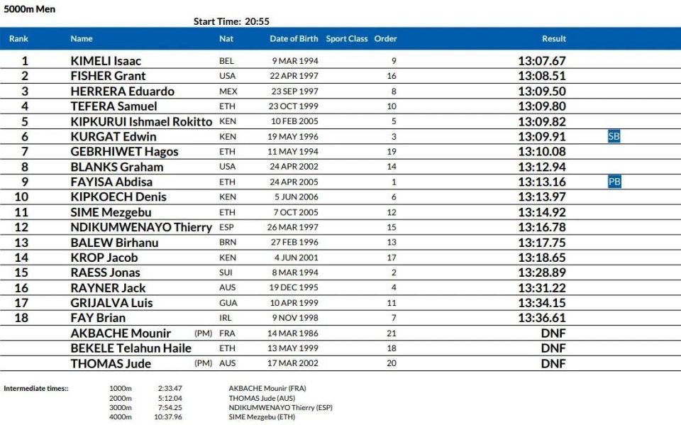 男子5000米——比利时选手基梅利以13:07.67夺冠。